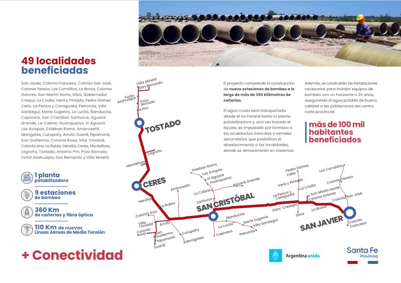 La obra del Acueducto San Javier-San Cristóbal-Ceres-Tostado en su etapa troncal, que abastecerá de agua potable a los departamentos San Javier, San Justo, San Cristóbal y 9 de Julio, ya fue adjudicada y en 45 días comenzarán las obras, que tienen como centro la Ciudad de San Javier. Esta obra histórica abastecerá a San Javier, Colonia Francesa, Colonia San José, Colonia Teresa, Los Corralitos, La Brava, Colonia Dolores, San Martín Norte y a otras localidades de la Provincia de Santa Fe.